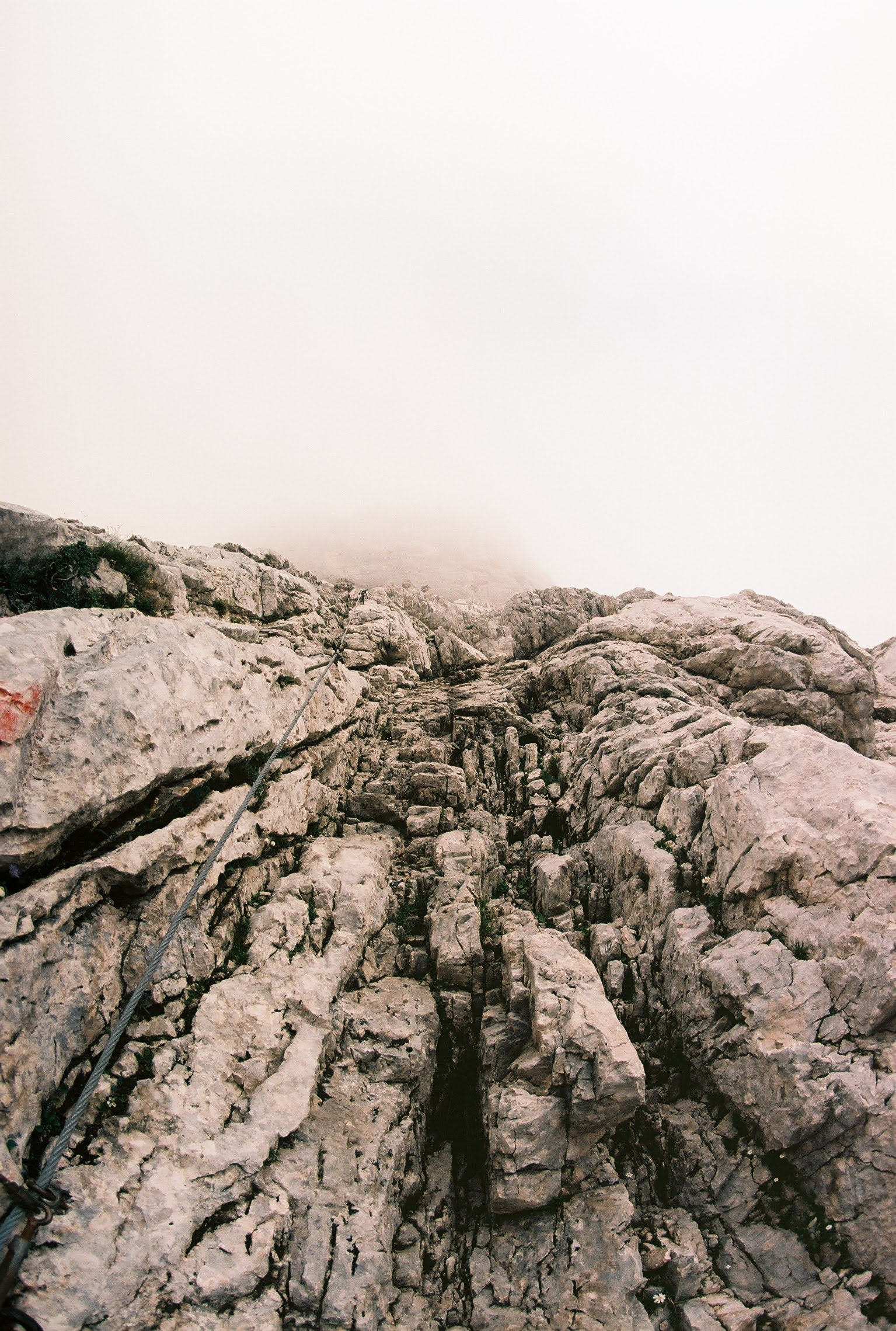 Mentre salivo era sempre tutto grigio e freddo ed il mio cuore batteva forte costringendomi a fare diverse pause per rifocillarmi. Strada facendo incontrai solo una persona: un uomo che stava scendendo perché aveva passato la notte in rifugio. Gli chiesi se fosse tutto ok lassù e se secondo lui potessi continuare e lui mi incoraggiò dicendo che con quel passo sarei arrivato ben presto. In effetti dopo poco più di un’oretta dall’attacco iniziai ad intravedere alcune parti della teleferica del rifugio, guardai con più attenzione e notai che era proprio la stazione di arrivo della teleferica!