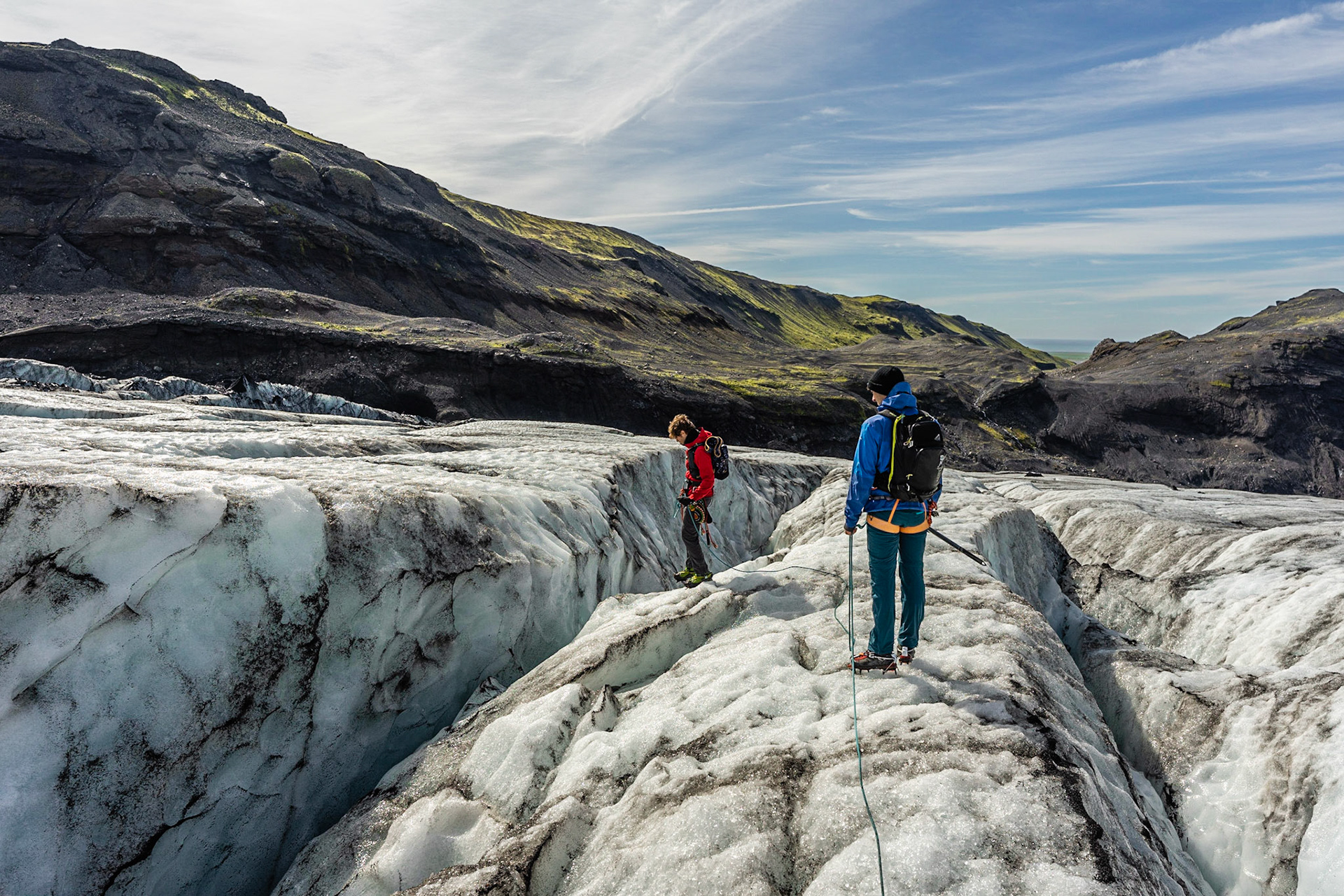 Arrivati al ghiaccio, abbiamo cercato un punto di accesso che potesse fungere da rampa naturale per poter approcciare sul ghiaccio e senza troppi ostacoli siamo finalmente saliti sulla massa. Questi ghiacciai, di origine vulcanica sono diversi dai nostri dell’arco alpino proprio per la presenza di cenere magmatica molto scura che ne ricopre alcune parti della superficie. Questa cenere crea un contrasto davvero impattante con l’azzurro acceso del ghiaccio perenne, un dettaglio che da fotografo ho amato molto. Abbiamo risalito il ghiacciaio per diversi chilometri cercando di memorizzare la traccia di salita. Questa lingua di ghiaccio larga qualche centinaia di metri e le forme si ripetono schematicamente, rendendo difficile ricordare il proprio percorso. Arrivati nel mezzo del ghiacciaio ci siamo messi a cercare i crepacci più belli, come se fosse una caccia fotografica, erano bellissimi e avevano dei colori e delle forme veramente fotogeniche. Abbiamo proseguito per ore alla ricerca di queste fantastiche geometrie, nel mezzo di uno degli scenari più belli che la natura può offrirci. Siamo davvero grati di aver vissuto intensamente quella giornata, e in Islanda non sarà di certo l’ultima nostra avventura.